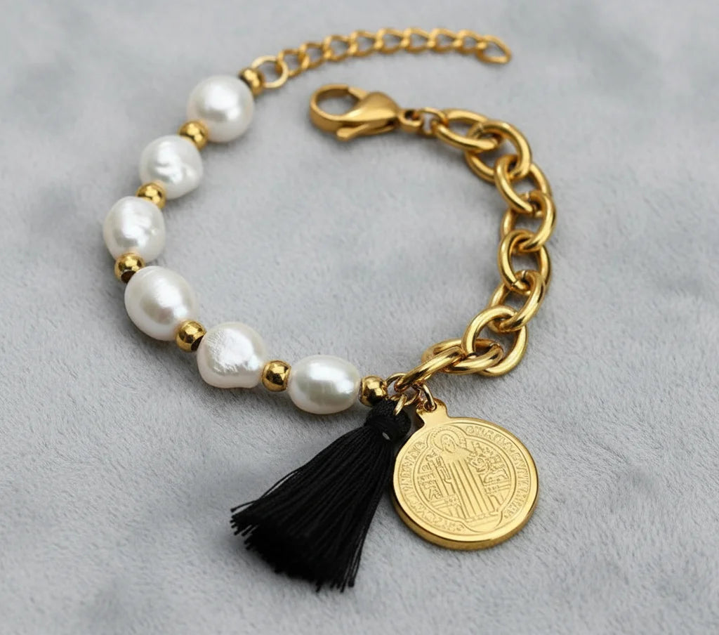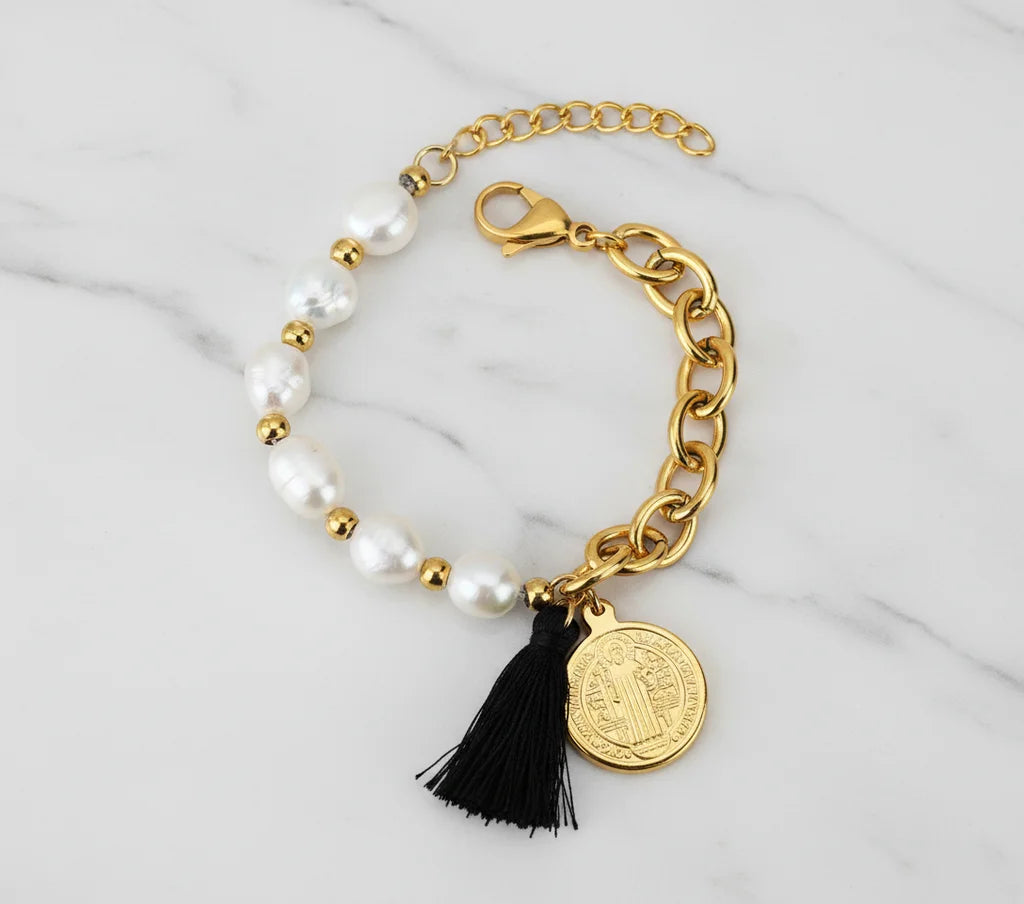 A harmonious blend of pearl, gold, and a delicate tassel, this bracelet is a sophisticated expression of devotion for every mindful moment.