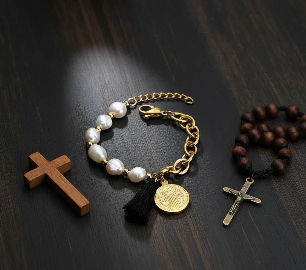 Crafted with enduring quality, featuring lustrous pearls and gold-toned accents, this bracelet is designed to be a lasting symbol of your faith and grace, beautifully adorning your spirit every day. A cherished piece for your mindful journey.